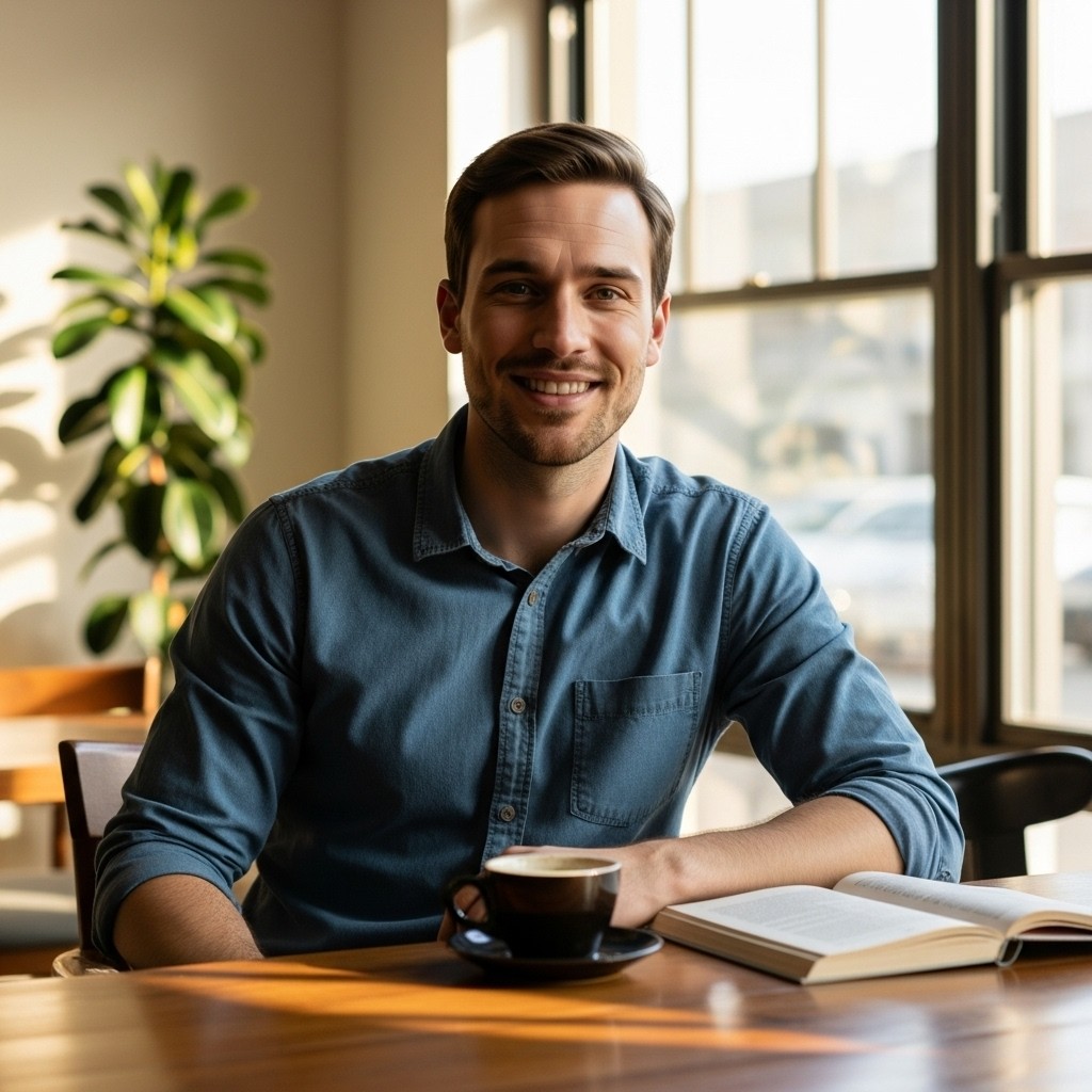Full Prompt: "Male model at cozy coffee shop, sitting by large window with natural light, genuine warm smile looking at camera with friendly eyes, wearing casual button-down shirt rolled at sleeves, coffee cup and open book on wooden table, soft morning light creating warm atmosphere, approachable welcoming energy"
