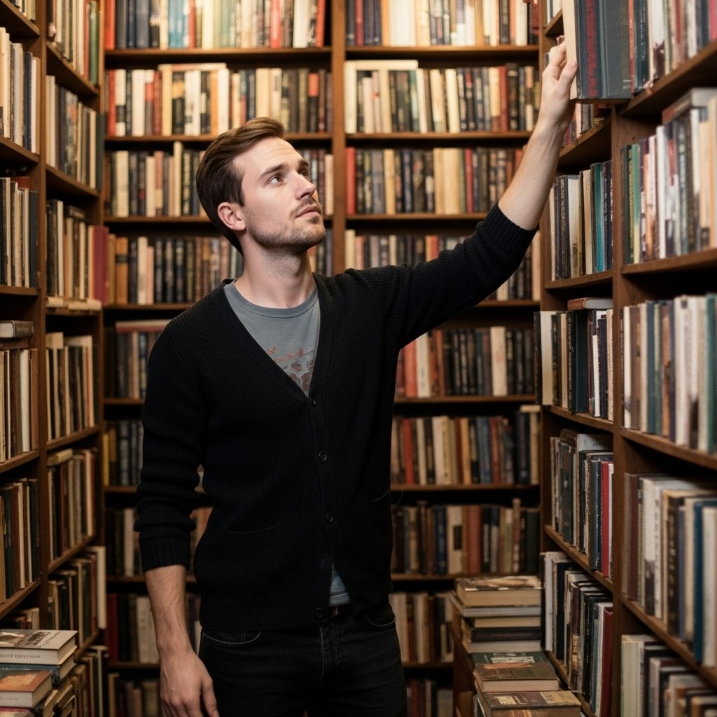 Full Prompt: "Male model browsing bookstore, reaching for book on high shelf, wearing smart casual outfit with cardigan and dark jeans, soft bookstore lighting, shelves of books creating cozy atmosphere, thoughtful concentrated expression, intellectual approachable aesthetic"