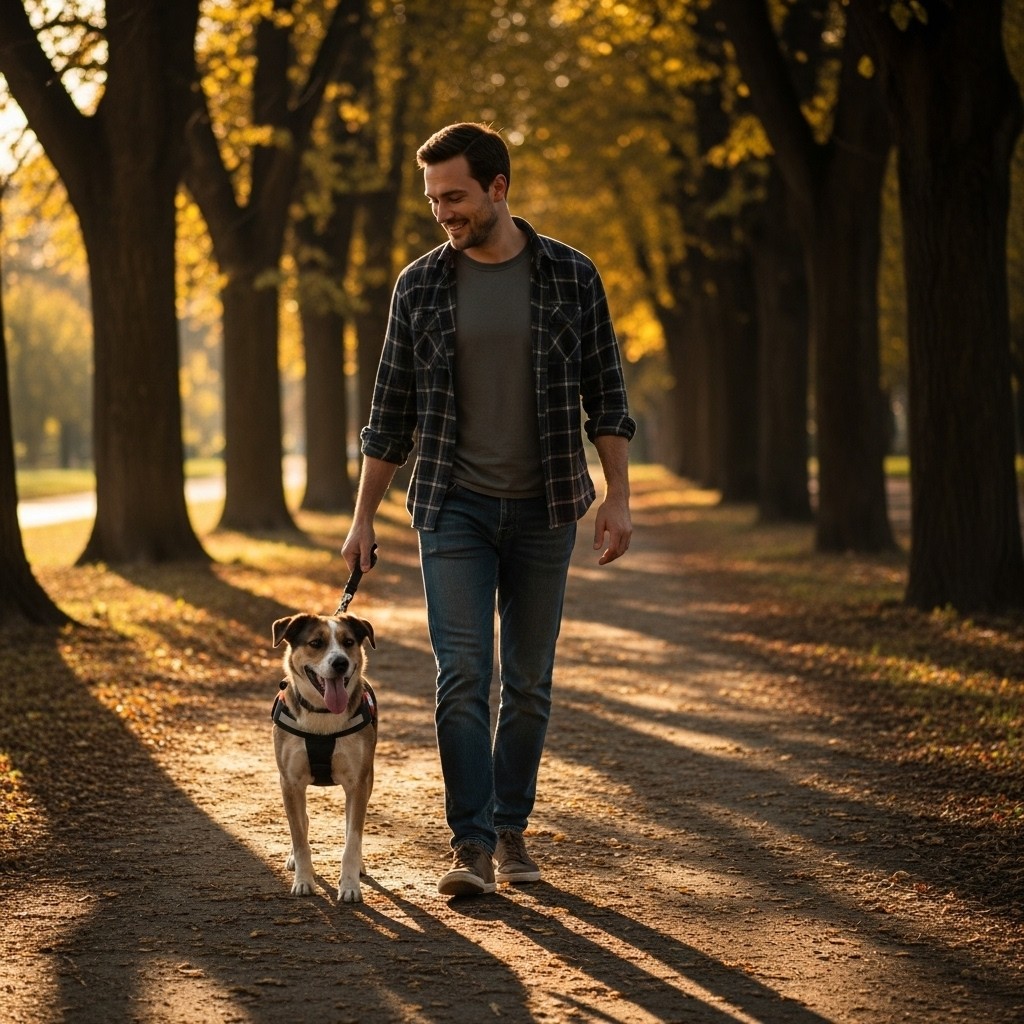 Full Prompt: "Male model walking adopted rescue dog on tree-lined path, both looking happy and content, wearing casual flannel and comfortable jeans, golden hour lighting through trees, genuine warm smile down at dog, rescue harness visible on dog, compassionate caring energy"