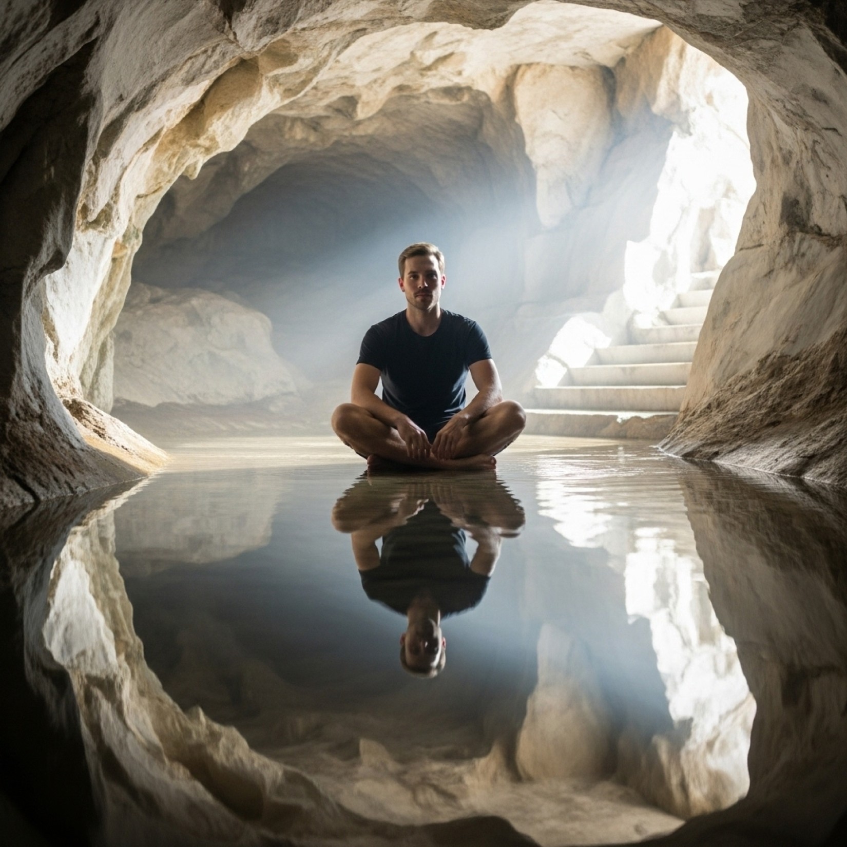 Full Prompt: "Male model in tree pose during outdoor yoga at park, wearing comfortable athletic wear, focused peaceful expression, early morning soft light, grass and trees creating natural backdrop, balanced centered energy, healthy mindful lifestyle aesthetic"