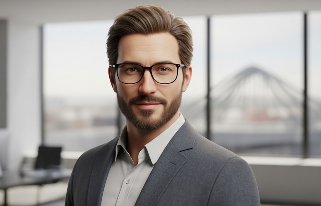 Portrait Approach: Contemporary framing, smart-casual attire, digital environment cues