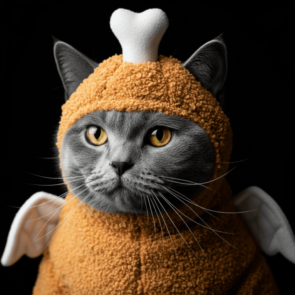 Solution: Simplify your humor concept and be more specific: "Pet wearing ONLY a tiny chef hat while looking serious" rather than a complex scenario.
