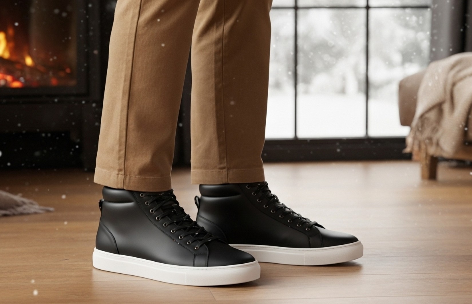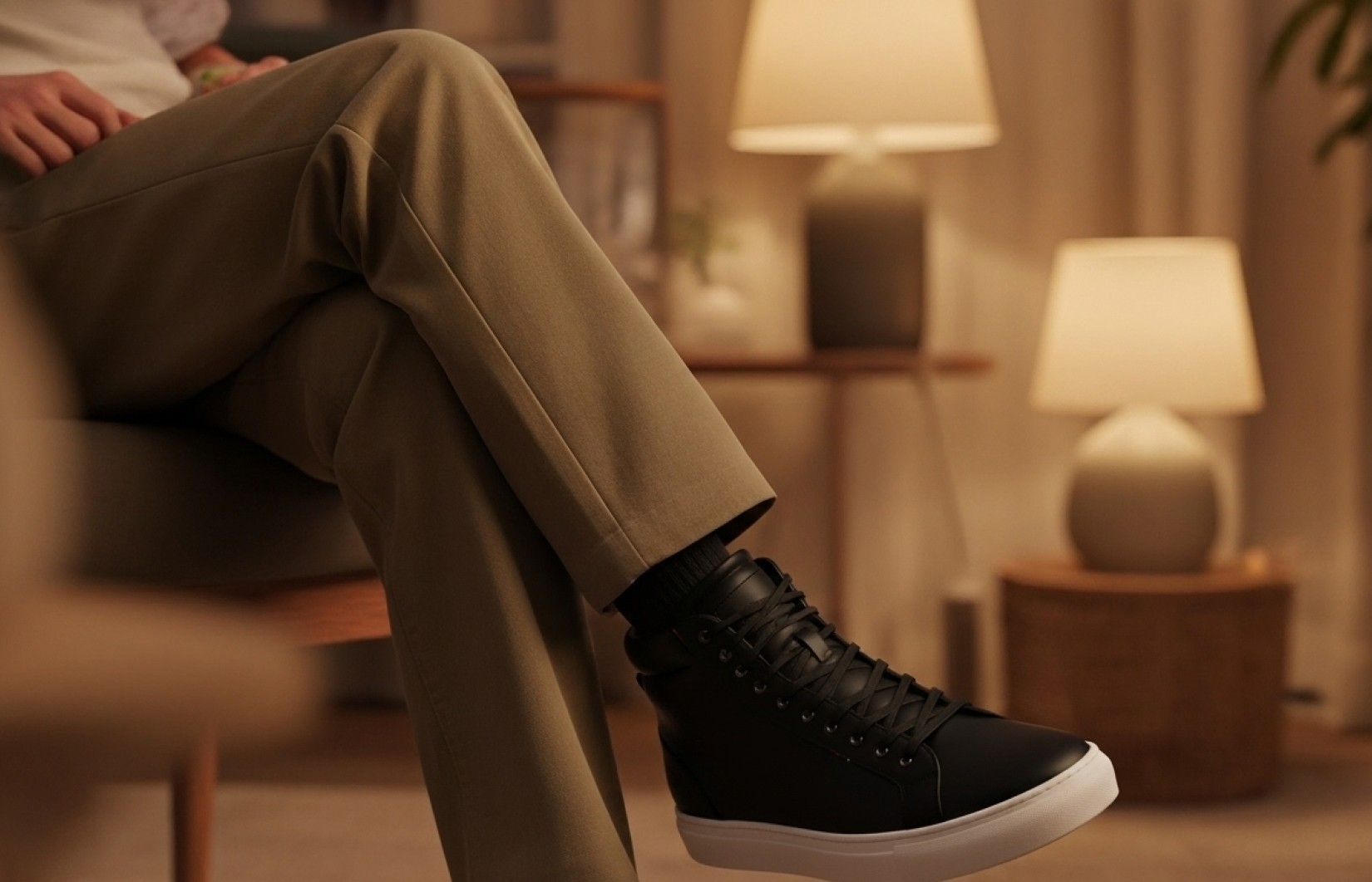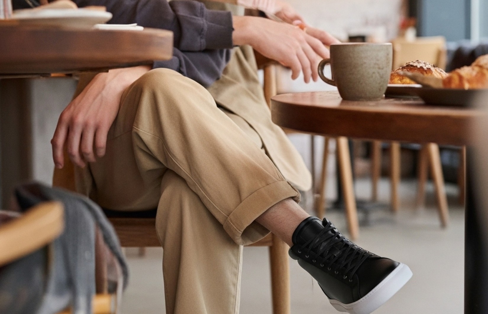 [Reference image], product in trendy café environment, warm ambient lighting, worn on male with semi-wide chinos wooden table/coffeehouse elements, authentic social/work moment, realistic urban lifestyle context, shallow depth of field focusing on product, photorealistic, 8K resolution