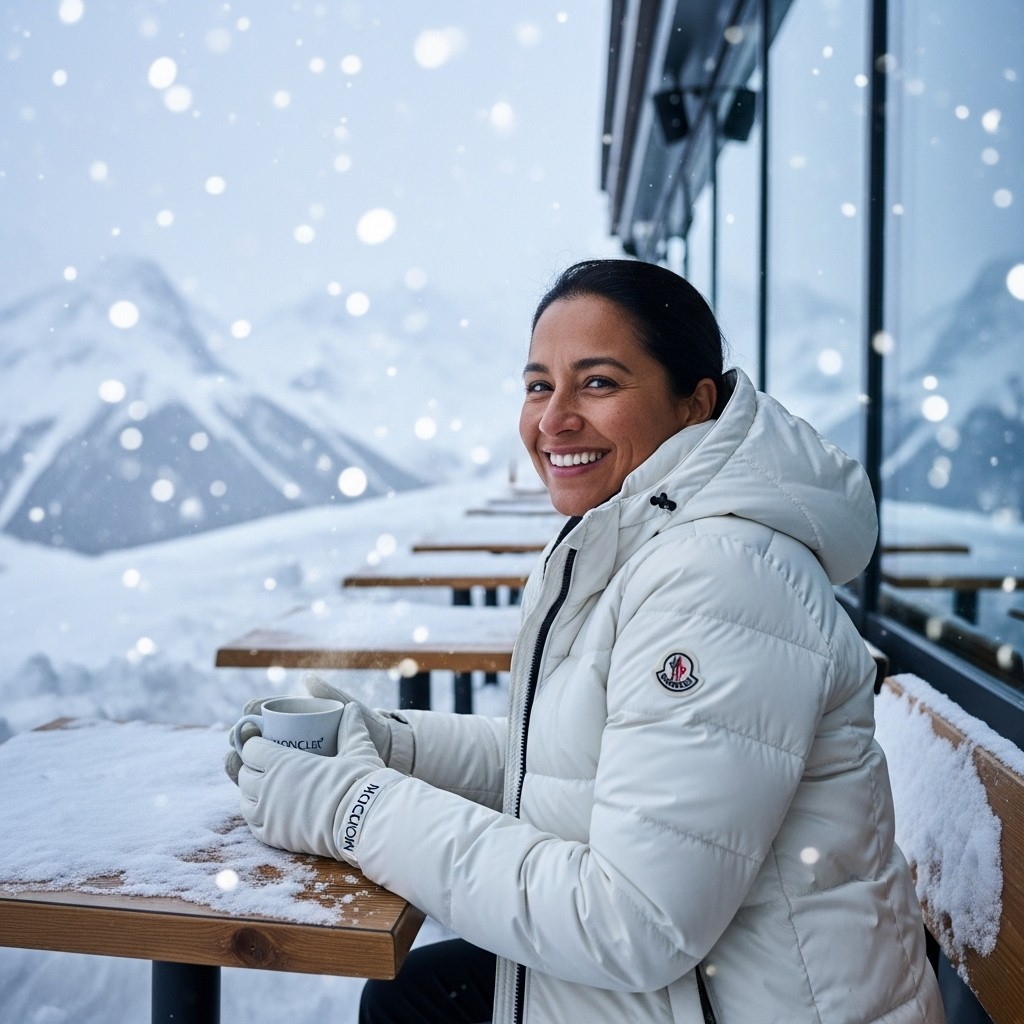 "Natural image of [appearance] person enjoying morning coffee in upscale kitchen/patio, content reflective expression, casual sophisticated attire, elegant morning setting, soft natural lighting, authentic daily moment, realistic features, established routine, high-quality photograph"